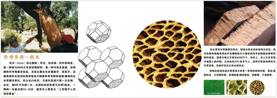 軟木具有獨特的細胞結(jié)構(gòu):它由六面體棱柱狀的死細胞呈網(wǎng)狀組成,每個細胞是相互獨立的而且細胞內(nèi)充有90%的空氣。